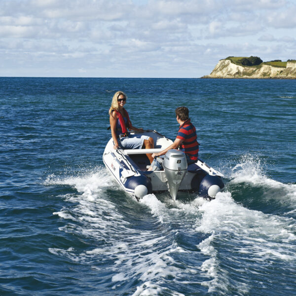 Barco insuflável, leve e portátil. Estrado em alumínio para 3 pessoas.